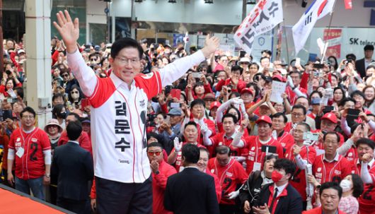 국민의힘 김문수 대선후보가 13일 울산 중구 뉴코아아울렛 울산 성남점 앞에마련된 유세장에서 지지자들을 향해 두손을 올리고 있다. 임현동 기자 |