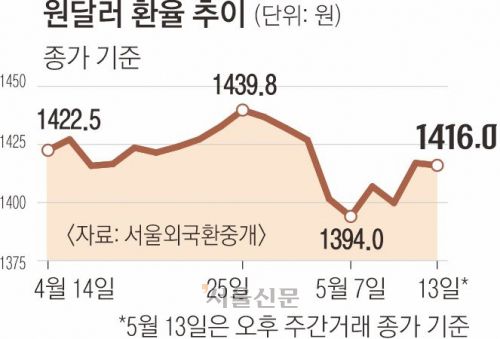 13일 서울외환시장에서 원달러 환율은 전 거래일 대비 13.6원 오른 1416.0원으로 주간거래를 마감했다. 원달러 환율이 주간거래 마감 기준 1410원을 넘어선 것은 지난달 30일(1421.0원) 이후 약 2주 만이다. 전날 들려온 미중 무역 협상 타결 소식에 미국 경기 및 산업을 둘러싼 불확실성이 일정 부분 해소되면서 달러 가치를 끌어올렸다. 주요 6개국 통화 대비 달러 가치를 나타내는 달러인덱스는 이날 오후 3시 30분 기준 101.62를 기록했는데 지난달 10일 이후 한 달여 만에 가장 높은 수준이다.