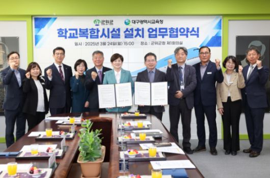 강은희(왼쪽 여섯 번째) 대구시교육감과 김진열(일곱 번째) 군위군수가 지난 3월 군위지역 주민의 정주 여건 개선을 위한 학교복합시설사업 추진 협약을 체결하고 기념 촬영을 하고 있다. 대구시교육청 제공 |