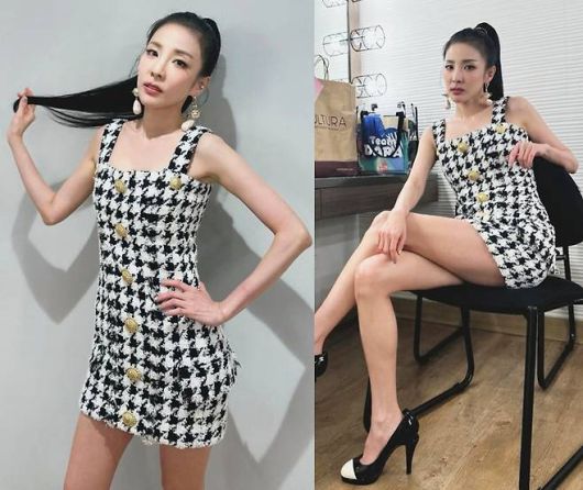 산다라박은 블랙&화이트 하운즈투스 체크 패턴의 트위드 미니 원피스를 완벽하게 소화하며 눈길을 끌었다. 사진=산다라박 SNS |