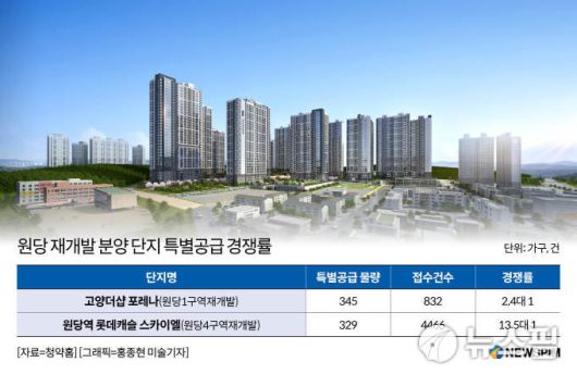 지난 2022년 공급됐던 '원당역 롯데캐슬 스카이엘(원당4구역 재개발)'과 비교하면 아쉬운 성적이다. 당시 329가구 모집에 4466명이 몰리며 특별공급 경쟁률은 평균 13.5대 1을 기록했다.