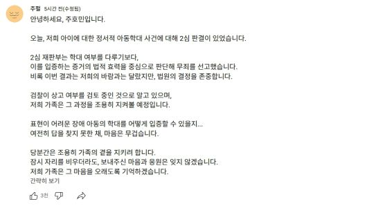 이어 "표현이 어려운 장애 아동의 학대를 어떻게 입증할 수 있을지... 여전히 답을 찾지 못한 채, 마음은 무겁습니다"라면서 "당분간은 조용히 가족의 곁을 지키려 합니다. 잠시 자리를 비우더라도, 보내주신 마음과 응원은 잊지 않겠습니다. 저희 가족은 그 마음을 오래도록 기억하겠습니다"라고 덧붙였다.