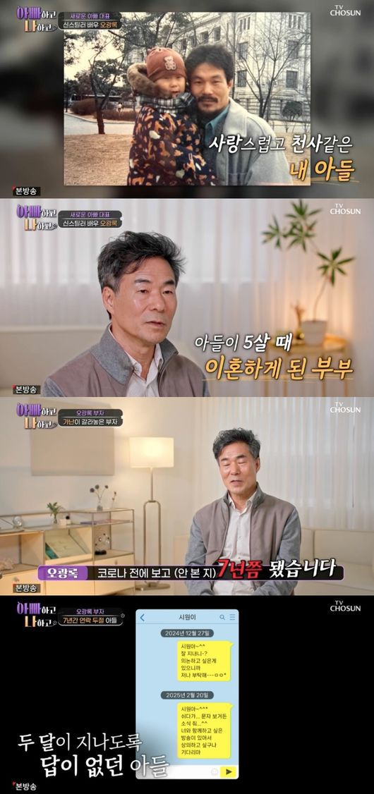 13일 방송된 TV CHOSUN '아빠하고 나하고'에는 새롭게 합류한 배우 오광록이 아들과 멀어진 사연을 공개했다.