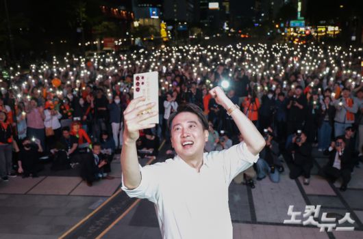 개혁신당 이준석 대선후보가 14일, 사흘만에 부산을 다시 찾는다. 집중유세에서 유세차에 올라 셀카를 찍고 있는 모습. 윤창원 기자 |