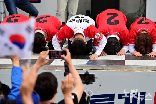 김문수 국민의힘 대선 후보가 13일 부산 중구 자갈치시장에서 유세 중 큰절을 하고 있다. 부산=황진환 기자 |