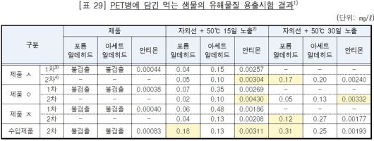 감사원 감사에서는 직사광선 노출 시 안전성을 파악하기 위한 실험도 진행됐습니다. 페트병에 담긴 생수를(국내 제품 3종과 수입 제품 1종) 여름철 오후 2~3시 정도의 자외선 강도와 50℃ 온도의 가혹 조건을 설정한 실험용 체임버에서 15일과 30일간 각각 노출한 뒤 생수의 수질을 검사하는 방식이었습니다. 15일 노출은 자연 상태에서 약 3.9개월에, 30일 노출은 7.8개월 정도에 해당한다고 감사원은 밝힙니다.