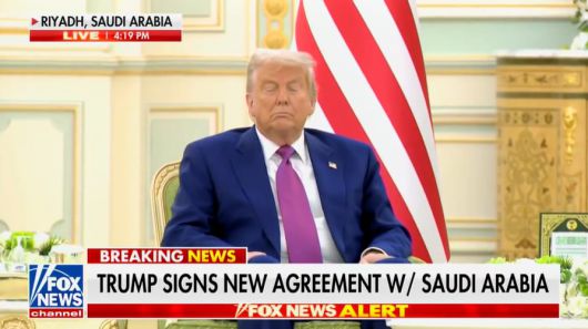 도널드 트럼프 미국 대통령이 13일 사우디아라비아 수도 리야드의 왕궁에서 무함마드 빈살만 왕세자와 만나 6000억원 달러(약 850조원) 규모의 협정을 체결하는 도중 조는 듯한 모습이 포착됐다. /X(옛 트위터) @atrupar |