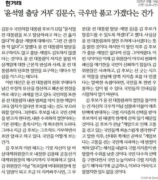 한겨레 = '윤석열 출당 거부' 김문수, 극우만 품고 가겠다는 건가