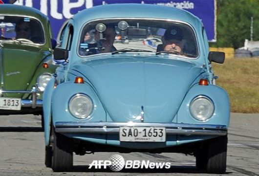 호세 무히카 전 우루과이 대통령이 재직당시 1987년에 생산된 하늘색 폭스바겐 비틀 승용차를 운전하고 있다./사진=AFPBBNews, News1 |