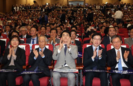 지난 11일 서울 여의도 국회 의원회관에서 더불어민주당 윤여준 상임총괄선대위원장, 박용진 전 의원 등이 참석한 가운데 사람사는세상 국민화합위원회 정책협약식이 열리고 있다. [사진 출처 = 연합뉴스] |