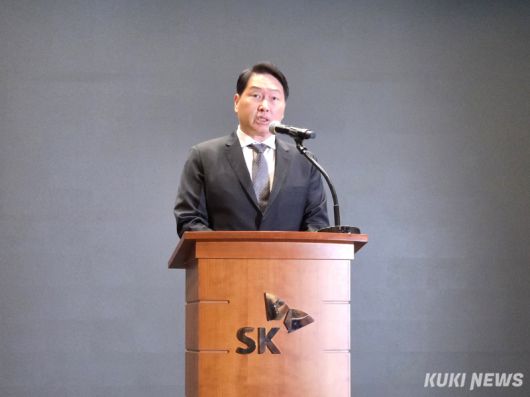 최태원 SK그룹 회장이 7일 서울 중구 SKT 본사에서 열린 SK텔레콤 해킹 사태 관련 일일 브리핑에서 정보보호혁신특별위원회 신설에 대해 설명하고 있다. 정우진 기자 |