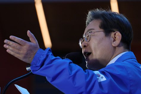 더불어민주당 이재명 대선 후보가 13일 울산광역시 롯데백화점 울산점 광장에서 지지를 호소하고 있다. (사진=연합뉴스) |