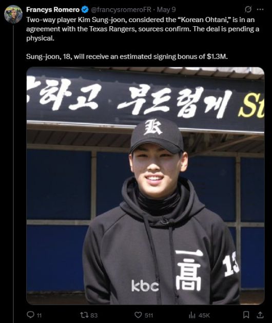 [서울=뉴스핌] 장환수 스포츠전문기자= 전미야구기자협회 소속 프란시스 로메로 기자가 9일 자신의 SNS를 통해 김성준의 텍사스 입단 소식을 전했다. [사진=프란시스 로메로] 2025.05.14 zangpabo@newspim.com |