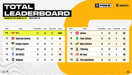 T1은 이날 6개 매치에서 치킨 2회 및 순위 포인트 26점, 킬 포인트 26점을 획득하며 토털 포인트 52점을 추가했다. 앞선 그룹 스테이지 경기를 포함한 누적 토털 포인트는 90점으로 당당히 종합 순위 1위에 올랐다. 최대 16개 팀까지 출전권이 주어지는 파이널 스테이지 진출이 확정됐다.