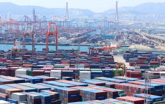 부산항 신선대부두, 감만부두에 컨테이너가 가득 쌓여 있는 모습. [사진: 연합뉴스] |