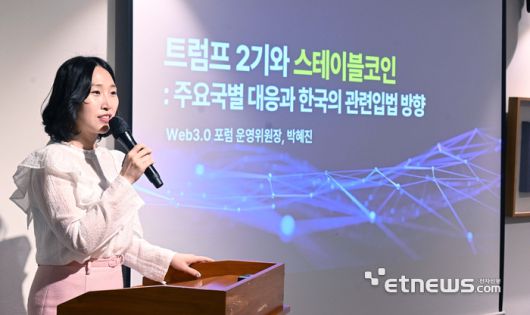 웹3.0 포럼 2025 조찬 라운드 테이블이 14일 서울 중구 달개비에서 열렸다. 박혜진 웹3.0 포럼 운영위원장이 '트럼프 2기와 스테이블코인 : 주요국별 대응과 한국의 관련입법 방향'에 대해 발표하고 있다. 박지호기자 jihopress@etnews.com [Copyright © 전자신문. 무단전재-재배포금지]