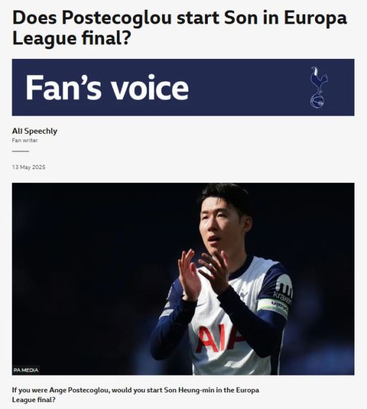특히 영국 공영방송 'BBC'는 13일(한국시간) "포스테코글루는 유로파리그 결승에서 손흥민을 선발로 기용해야 하는가?"라는 제목의 분석 기사를 통해 손흥민의 출전 여부를 단순한 감정적 선택이 아닌 냉철한 전략적 판단의 대상임을 주장했다.