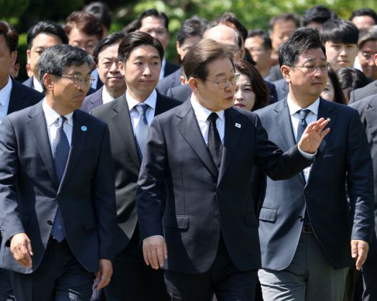 이재명 더불어민주당 대통령 후보가 14일 부산시 남구 유엔기념공원 찾아 참배를 위해 이동하고 있다. 연합뉴스 |