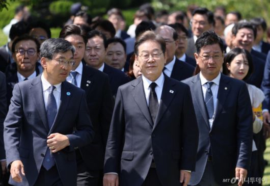 [부산=뉴시스] 권창회 기자 = 이재명 더불어민주당 대선 후보가 14일 부산 남구 유엔기념공원을 방문해 참배하기 위해 이동하고 있다. (공동취재) 2025.05.14. photo@newsis.com /사진=류현주 |