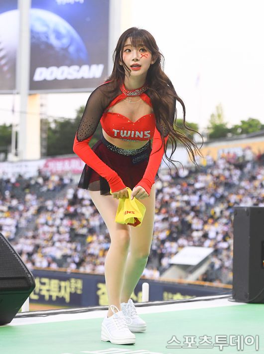 [스포츠투데이 팽현준 기자] 13일 서울 잠실야구장에서 열린 2025 KBO리그 키움 히어로즈와 LG 트윈스의 경기, LG 치어리더 이주은이 공연을 하고 있다. 2025.05.13. [스포츠투데이 팽현준 기자 sports@stoo.com]