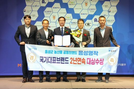 [음성=뉴스핌] 백운학 기자 = 충북 음성군의 농산물 공동 브랜드 '음성명작'이 14일 '2025 국가대표 브랜드 대상' 시상식에서 2년 연속 농특산물 공동 브랜드 부문 대상을 수상했다.