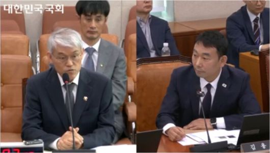 김용민 더불어민주당 의원(오른쪽)이 14일 국회에서 열린 법제사법위원회 전체회의에서 천대엽 법원행정처장(왼쪽)에게 질의를 하고 있다. 국회의사중계시스템 갈무리 |