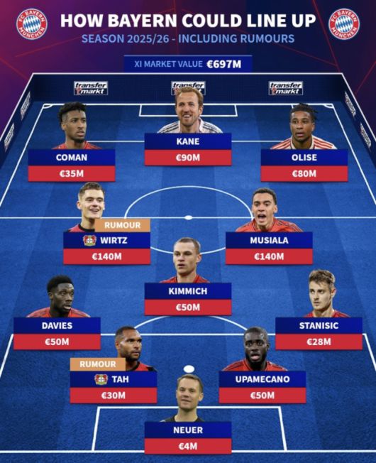 현재 뮌헨과의 이적 루머에 엮인 선수들이 포함된 다음 시즌 예상 베스트 11에는 이번 시즌 뮌헨의 뒷공간을 책임졌던 김민재-다요 우파메카노 조합 대신 타-우파메카노 센터백 조합이 선택됐다.