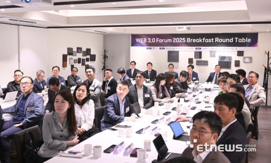 웹3.0 포럼 2025 조찬 라운드 테이블이 14일 서울 중구 달개비에서 열렸다. 왼쪽부터 임종인 대통령비서실 사이버특별보좌관, 빈대인 BNK금융지주 회장, 민병덕 더불어민주당 의원, 박수용 웹3.0 포럼 의장, 강병준 전자신문 대표가 발표를 듣고 있다. 박지호기자 jihopress@etnews.com |