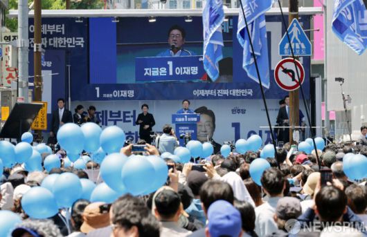 [부산=뉴스핌] 정일구 기자 = 이재명 더불어민주당 대선 후보가 14일 오전 부산 부산진구 서면에서 열린 유세에서 지지를 호소하고 있다. 2025.05.14 mironj19@newspim.com