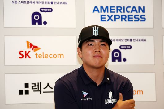 장유빈이 14일 제주 서귀포 핀크스GC에서 열린 KPGA 투어 SK텔레콤 오픈 개막 전 기자회견에서 취재진의 질문을 듣고 있다. [KPGA 제공] |