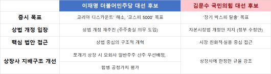양 후보 모두 증시 부양을 공통 화두로 삼았지만, 법 개정의 방식과 수위에선 뚜렷하게 갈린다. 이 후보가 법제도 근간부터 손질해 주주권 보호를 제도화하려는 반면, 김 후보는 '시장 친화적 접근'과 세제 유인을 통해 자본시장에 활력을 불어넣겠다는 구상이다.