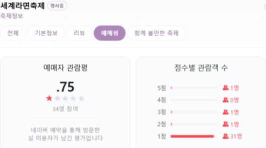 앞서 지난 2일부터 11일까지 부산 기장군 오시리아 관광단지에서 열린 ‘세계라면축제’는 미흡한 준비로 인해 방문객들로부터 평점 0점을 받는 등 굴욕을 당했다. 축제에 대한 기대와 달리 방문객들은 국내라면 종류는 단 2종 뿐이었으며 뜨거운 물이 나오지 않아 라면을 먹지도 못하는 상황이라며 혹평을 했다. 특히 무료였더라도 실망했을 축제의 퀄리티에 돈까지 내고 입장했다는 사실에 불만을 토로했다. 실제 방문객들의 리뷰에는 “살면서 본 최악의 축제다”, “세계라면 축제장보다 우리 집에 있는 라면이 더 다양하다”, “이걸 돈을 받다니 사기다” 등의 후기가 이어졌다.