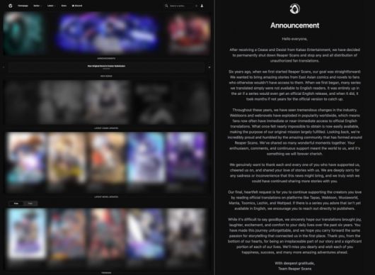 리퍼스캔스 운영진은 9일 웹사이트에 올린 공지문에서 "카카오엔터테인먼트에서 중단 요청을 받은 후 리퍼스캔스는 불법 번역본의 무단 배포를 전면 중단하고, 사이트를 영구적으로 종료하기로 결정했다"며 "마지막으로 간곡한 부탁을 드린다. 공식 플랫폼에서 공식 번역본을 이용함으로써 여러분이 좋아하는 창작자들을 계속해서 응원해 달라"고 적었다. 오랜 기간 큰 파급력을 가졌던 불법유통 사이트의 갑작스러운 중단 선언과 공식 플랫폼 소비 독려에 콘텐츠 합법 소비를 둘러싼 글로벌 만화 팬들의 반응도 X, 디스코드, 레딧 등 온라인 커뮤니티를 중심으로 활발히 이어지고 있다.