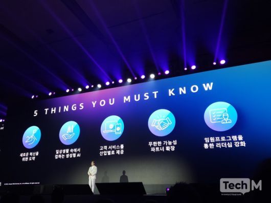 또한 스토리지 부문에서 아마존 S3를 소개하며 "오늘날 AI 워크로드와 애널리틱스는 융합되고 있어 협업을 가속화하는 것이 무엇보다 중요해지고 있다"고 말했다. 추론 부문의 아마존 베드록과 함께 효과적인 생성형 AI 애플리케이션 구축을 위한 다섯 가지 요소로 모델 선택 맞춤화 신뢰와 안전 경제성 유틸리티를 제시하기도 했다.