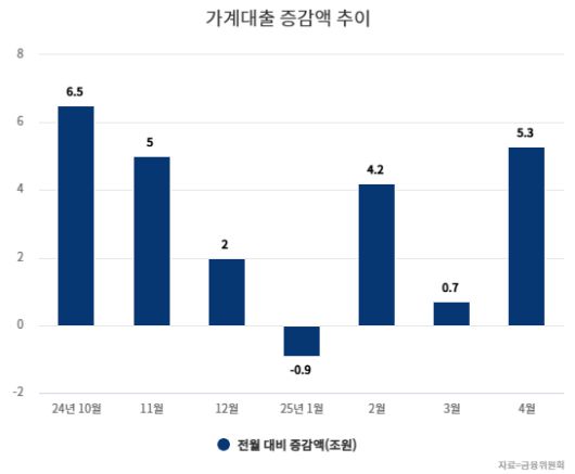 작년 하반기 급증했던 가계대출은 올해 1월 9000억원 줄며 감소 전환했지만 한 달 만인 2월 4조원 이상 늘며 오름세로 돌아섰다. 3월 다소 주춤했으나 4월 들어 증가 흐름이 다시금 확대되는 양상이다.
