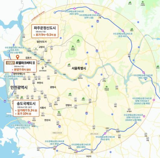 이와 유사한 흐름은 제2순환고속도로 주변에서도 관측되고 있다. 인천 송도국제도시 3공구에 위치한 ‘송도더샵마스터뷰’는 전용 84㎡ 기준 최근 9.3억원에 실거래됐고, 호가는 10억원에 달하고 있다. 파주 운정신도시의 ‘아이파크’도 유사한 전용면적에서 9억~9.5억원의 호가를 기록 중이며, 이들 지역은 수도권 제2순환고속도로의 직접적인 수혜지로 평가받는다.