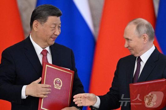 블라디미르 푸틴 러시아 대통령과 시진핑 중국 국가주석이 8일(현지시간) 모스크바 크렘린 궁에서 회담을 마친 뒤 협약서를 교환하고 있다. 2025.05.09 ⓒ AFP=뉴스1 ⓒ News1 우동명 기자 |