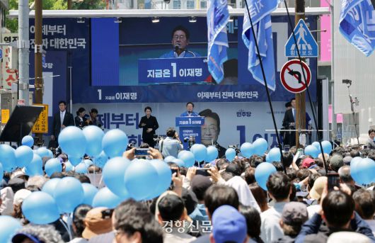 14일 오전 더불어민주당 이재명 대통령 후보가 약세지역인 부산지역 공략에 나섰다. 대표적인 부심가 서면 거리에서 유세하는 이 후보와 옥상 경찰경호 모습. 박민규 선임기자 |