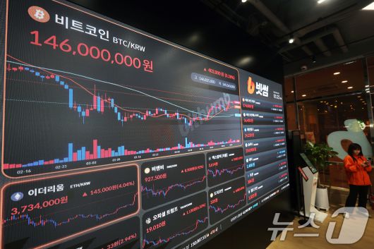 (서울=뉴스1) 황기선 기자 = 14일 서울 서초구 빗썸라운지 전광판에 비트코인 등 가상자산 시세가 표시되고 있다. 지난달 미국 소비자물가지수(CPI)가 4년 만에 최저치를 기록하면서 비트코인(BTC) 가격이 10만 4000달러까지 상승했다. 이날 오전 9시 40분 빗썸 기준 국내 비트코인 가격은 전날 같은 시간보다 0.28% 오른 1억 4601만 2000원을 기록 중이다. 2025.5.14/뉴스1
