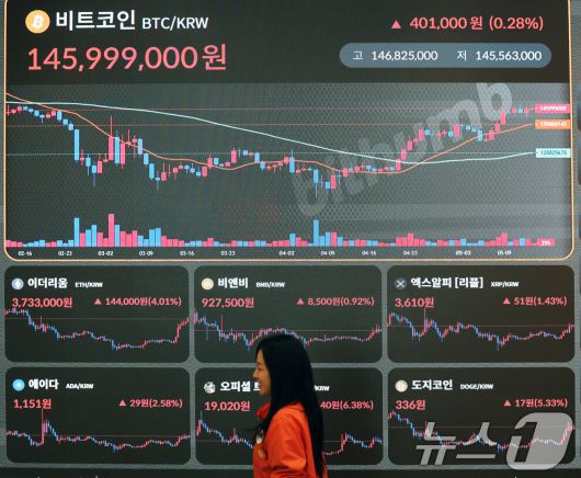 (서울=뉴스1) 황기선 기자 = 14일 서울 서초구 빗썸라운지 전광판에 비트코인 등 가상자산 시세가 표시되고 있다. 지난달 미국 소비자물가지수(CPI)가 4년 만에 최저치를 기록하면서 비트코인(BTC) 가격이 10만 4000달러까지 상승했다. 이날 오전 9시 40분 빗썸 기준 국내 비트코인 가격은 전날 같은 시간보다 0.28% 오른 1억 4601만 2000원을 기록 중이다. 2025.5.14/뉴스1