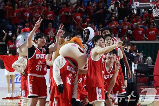 13일 오후 서울 송파구 잠실학생체육관에서 열린 '2024-25 KCC 프로농구 챔피언결정전 5차전' 창원 LG 세이커스와 서울 SK 나이츠의 경기에서 86대56으로 승리한 SK 선수들이 셀카를 찍고 있다. 2025.5.13/뉴스1 ⓒ News1 박세연 기자 |
