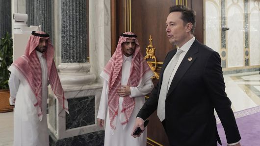 ▲ 13일(현지시간) 사우디 왕세자 맞기 위해 이동하는 일론 머스크