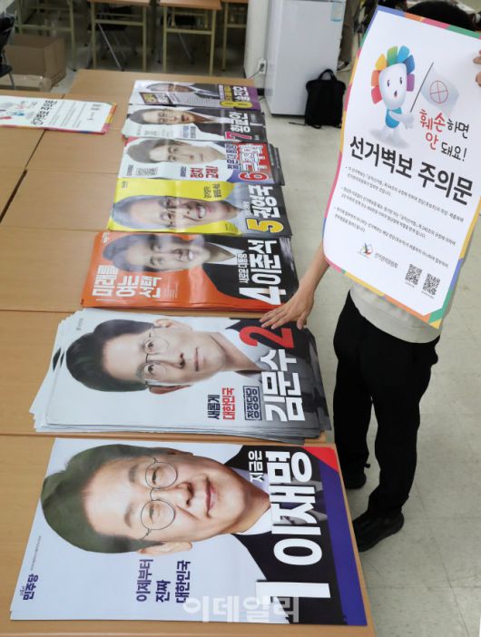 [이데일리 김태형 기자] 서울시선거관리위원회 관계자들이 14일 서울 중구 남산스퀘어빌딩 회의실에서 제21대 대통령선거 후보자 벽보를 점검하고 있다.