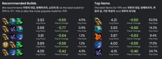 나머지 남는 아이템은 자르반과 징크스에 적당히 나눠서 배치하면 된다. 치유 감소 옵션은 자르반에게 태양 불꽃 망토를 장착시켜 활성화해준다.