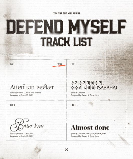 공개된 트랙리스트에 따르면 엑신의 세 번째 미니앨범 'Defend Myself'에는 타이틀곡 'Attention seeker'를 비롯해 '수리수리마하수리 수수리 사바하 (SABAHA)', 'Bitter love', 'Almost done'까지 총 4곡이 수록된다.