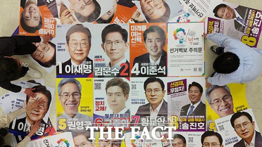 [더팩트ㅣ서예원 기자] 제21대 대통령선거를 20일 앞둔 14일 오후 서울시 중구선관위에서 선관위 관계자들이 접수된 선거벽보를 살펴보고 있다.