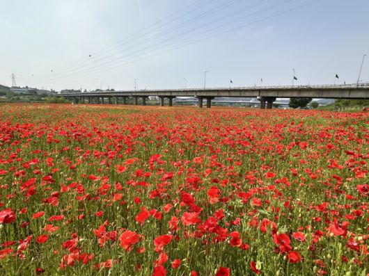 나주시가 영산강정원 들섬과 둔치체육공원 일대 14만㎡(4만2000여 평)에 조성한 꽃양귀비밭이 붉게 물들어 장관일 이루고 있다. /나주시