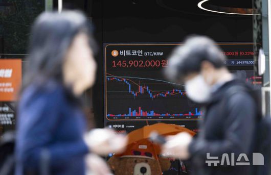[서울=뉴시스] 김근수 기자 = 가상화폐 비트코인이 미·중 무역 협상 기대감에 주말 동안 1억4600만원대를 회복하며 80일 만에 반등한 12일 서울 강남구 빗썸 고객 라운지 전광판에 시세가 나오고 있다. BTSE의 제프 메이는 무역 긴장 완화가 위험 자산에 대한 수요를 자극해 비트코인 강세를 이끌고 있다고 분석했다. 비트코인 강세지수도 급등하며 사상 최고가 돌파 가능성에 대한 기대감이 커지고 있다. 2025.05.12. ks@newsis.com |