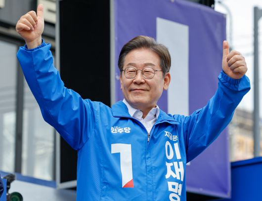 더불어민주당 이재명 대선 후보가 14일 경남 창원시 상남분수광장에서 열린 집중 유세에서 연설을 마친 뒤 엄지를 들어 보이며 인사하고 있다. [연합] |