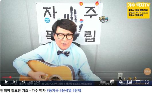 지난해 3월 말 가수 백자가 자신의 유튜브 채널에 올린 '탄핵이 필요한 거죠' 영상의 한 장면. 윤석열 전 대통령을 풍자하는 노래를 하고 있는 영상이다. 유튜브 채널 '백자TV' 캡처 |
